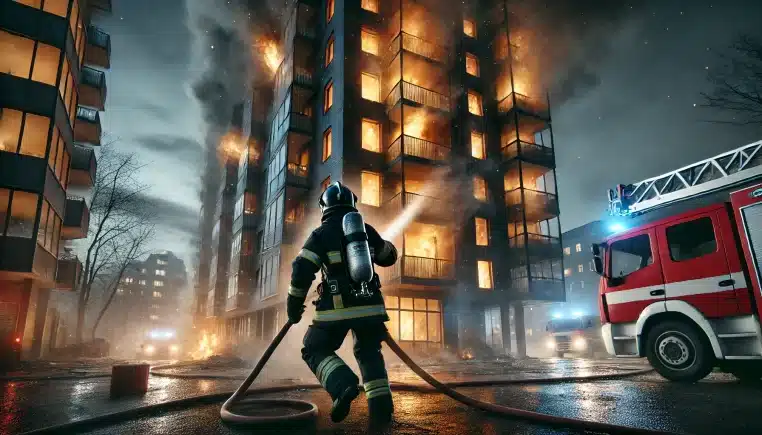 Au sixième étage d’un immeuble en flammes, une superbe jeune femme, en déshabillé vaporeux hurle :