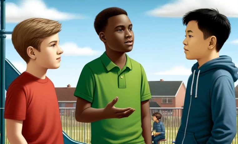 L’histoire ce passe dans une cour de récréation. Trois petits garçons discutent.