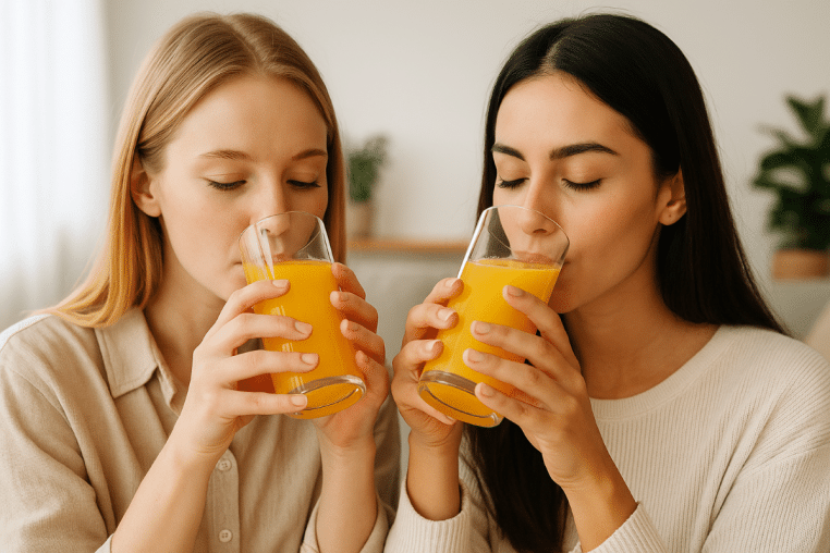 Une blonde et une brune prennent leur petit déjeuner. Habituellement, elles boivent un grand verre de jus de pomme, mais cette fois, elles optent pour un bon jus d’orange qu’elles ont acheté la veille au supermarché. Au bout d’une quinzaine de minutes, la brune a finalement terminé son verre. Mais la blonde reste fixée sur son verre. Alors la brune demande à son amie :