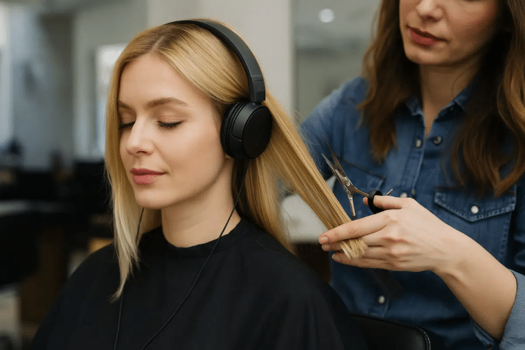 – Surtout, coupe-moi les cheveux à l’avant et à l’arrière… mais ne touche pas à mon baladeur !