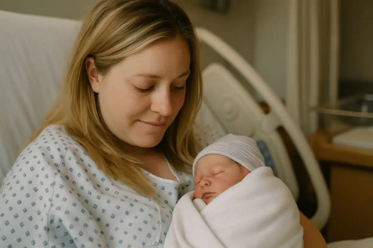 Une jeune femme blonde vient d’accoucher