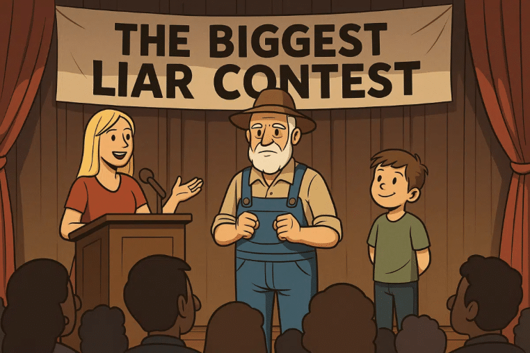 Dans un petit village, chaque année, un concours très spécial a lieu : le championnat du plus grand menteur. Les participants viennent des quatre coins de la région. Chacun monte sur scène, raconte le plus gros bobard possible, et le jury vote. Mais attention, les prêtres, les juges et les politiciens sont interdits de concours… parce qu’ils ont un avantage déloyal.