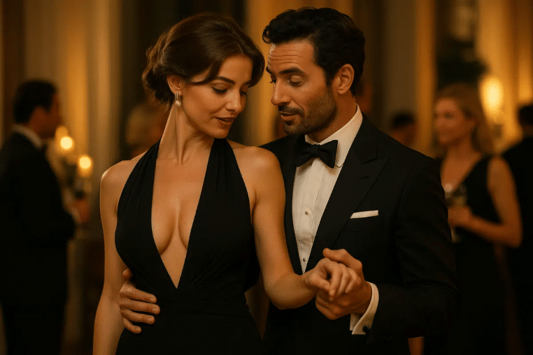 Dans une soirée-cocktail très chic, une jeune femme danse un slow langoureux avec un play-boy de la jet-set. Elle le drague ouvertement :