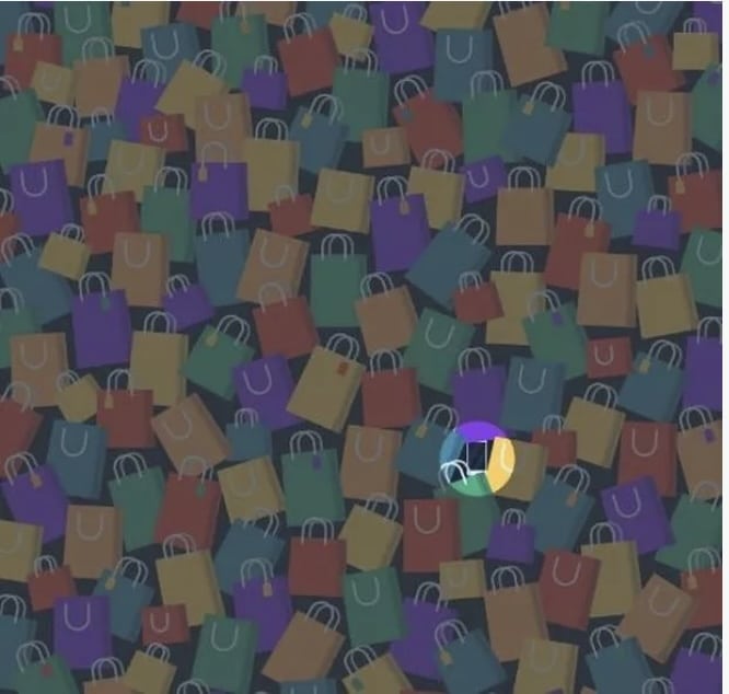 Sur l’image ci-dessous, des sacs de toutes les couleurs. Le défi est simple : retrouvez le téléphone portable perdu au milieu de cet amas de sacs.