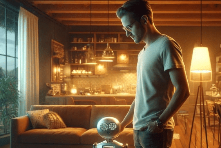 Un homme rentre chez lui avec un robot détecteur de mensonges