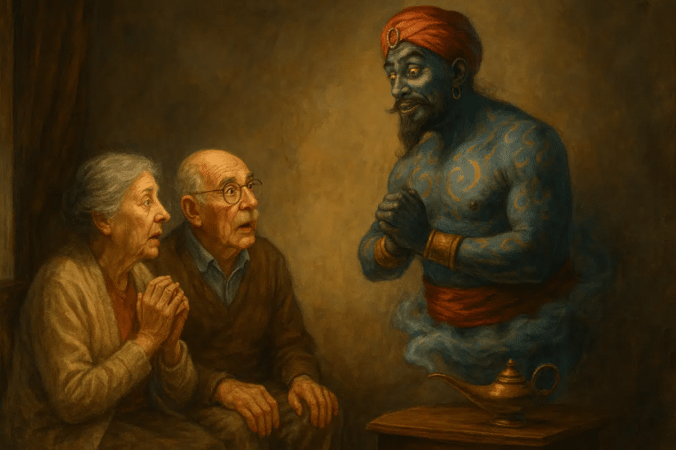Un couple âgé fête ses 60 ans de mariage. Un génie apparaît et leur propose un vœu chacun. La femme dit :