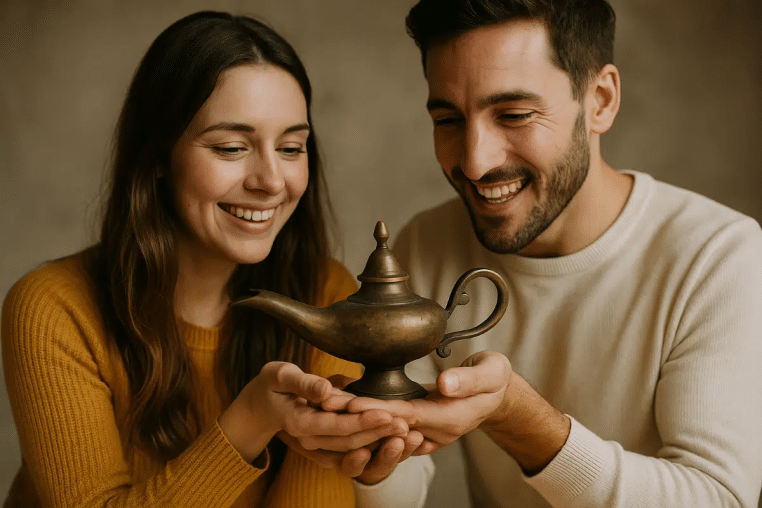 Un couple marche sur la plage et trouve une lampe magique. Ils frottent, un génie apparaît et dit :