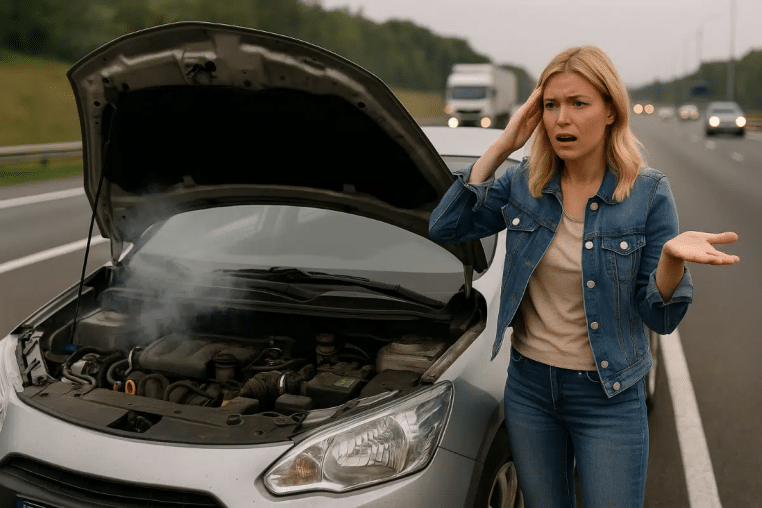Un homme tombe en panne sur l’autoroute. Sa femme blonde appelle le dépanneur :