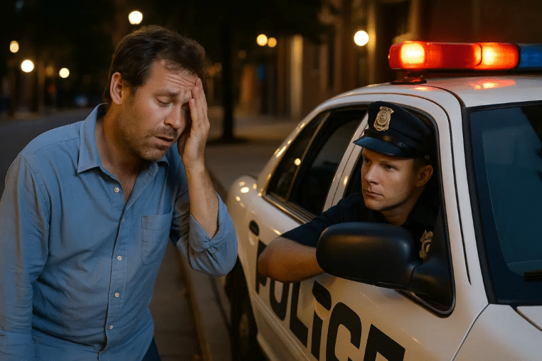 Un policier arrête un homme complètement ivre qui zigzague sur le trottoir.