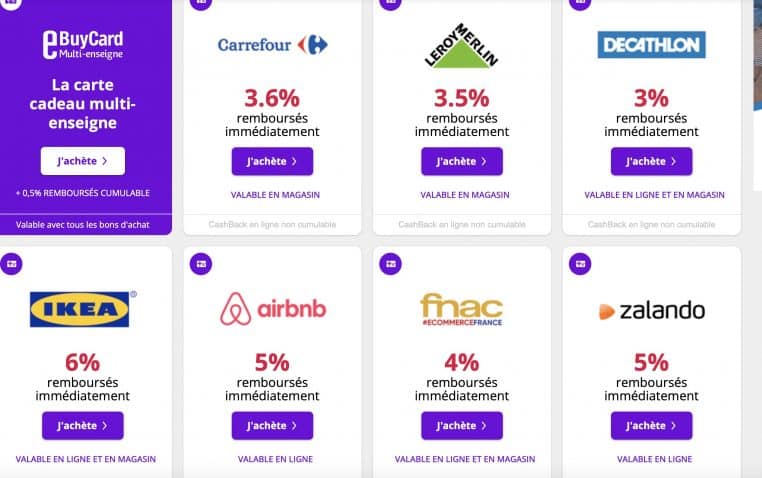 Sur le site, vous pouvez également obtenir des bons d’achat, utilisables en magasin et en ligne. Ils vous sont directement envoyés par mail. Ils sont aussi cumulables avec d’autres promotions. En ajoutant le bon d’achat dans votre panier, vous payerez le montant correspondant mais le pourcentage Cashback sera directement envoyé sur votre cagnotte.