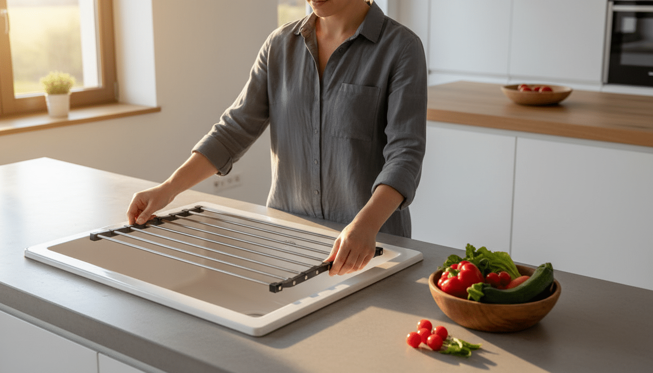 L’égouttoir SilverCrest ne se limite pas à la vaisselle. Sa structure en maille fine permet d’y rincer et égoutter des légumes, des fruits, des pâtes ou encore de la vaisselle légère. L’eau s’évacue rapidement à travers la grille, sans stagnation. C’est ce point précis qui évite les fameuses flaques que tout le monde connaît — ce petit lac tiède qui se forme autour de l’évier et qu’on finit par ignorer jusqu’à ce qu’un torchon tombe dedans.