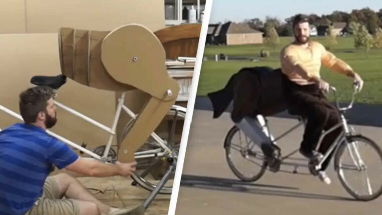 Kyle Scheele a partagé sur TikTok une vidéo qu’il a réalisée il y a quelques années, lorsqu’il avait transformé un tandem en centaure. Si cette idée vous semble étrange, Kyle affirme que pour lui, c’est bien la première idée qu’il a eue en voyant pour la première fois ce tandem dans une quincaillerie. « La première idée que j’ai eue était que si j’enlevais la selle à l’arrière et que je la remplaçais par le derrière d’un cheval, ça ressemblerait à un centaure qui roule à vélo ».