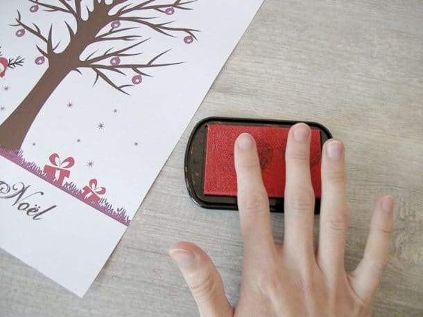2. Équipez le petit d’un petit tablier (on ne sait jamais). Il n’a plus qu’à appuyer fermement son pouce dans le tampon. Pour un petit, mieux vaut que ce soit le pouce, sinon ce sera un arbre avec des mini-feuilles. Quoi que ça peut être très joli.