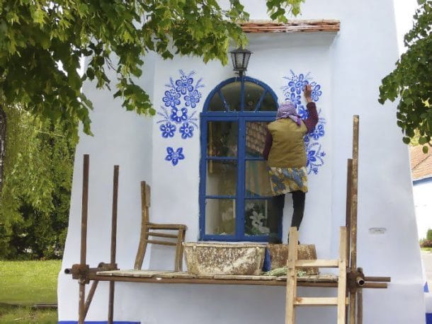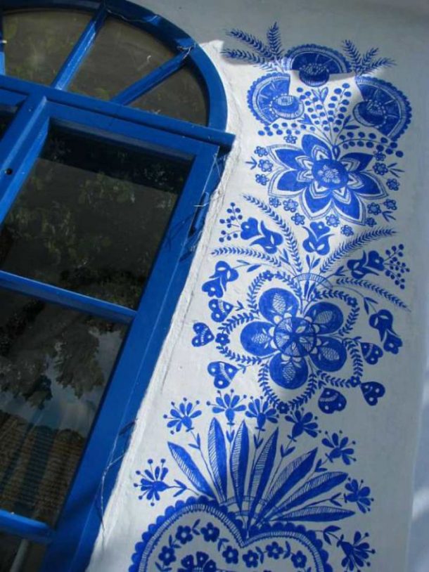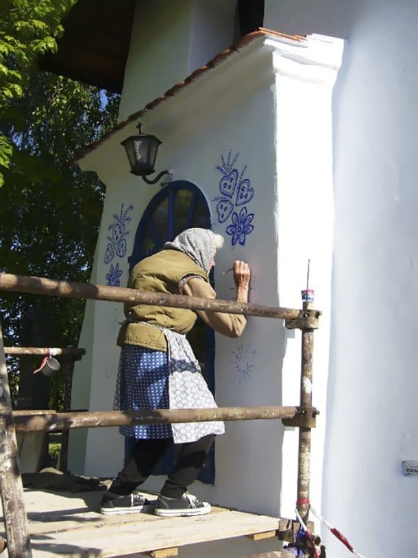Ses outils sont une peinture bleue vibrante et une petite brosse, avec laquelle elle réalise des motifs incroyables. Elle peint également les autres maisons du village. On n’imagine à peine la patience et la minutie que requièrent un tel travail. Anežka fait ça juste « pour le plaisir », elle est véritablement passionnée et veux contribuer à rendre sa ville plus jolie. Elle a appris cet art par une autre femme du village et en a fait une passion. Voilà qui nous prouve une fois encore, que l’âge n’est qu’un nombre. Surtout lorsqu’il est question de laisser parler son talent et sa créativité. On vous laisse découvrir le travail d’Anežka.