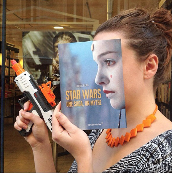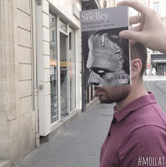 Donc revenons à nos book faces. Il s’agit en fait de transposer la couverture d’un livre – la dite couverture dévoilant un visage, sinon ça ne marche pas – sur sa tronche. En gros, c’est un peu comme si le livre était la continuité de votre joli minois. Ou comme si votre minois était la continuité du livre, je ne sais pas trop. Bref, découvrez les images !