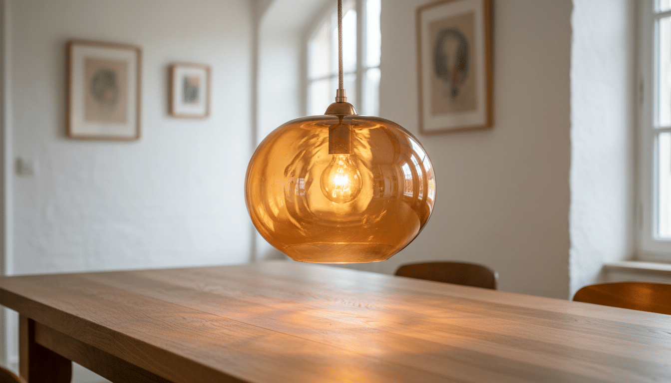Globe en verre ambré + murs blancs cassés : le doré chaud du verre réchauffe immédiatement les tons neutres.