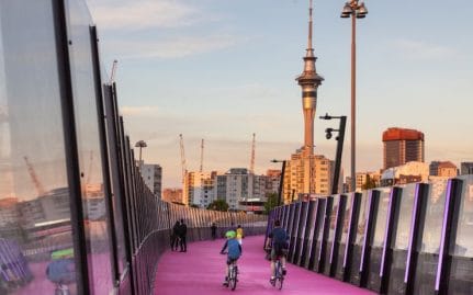Cette piste cyclable à Auckland, la Nelson Street Cycleway, en Nouvelle-Zélande est imaginée comme une oeuvre d’art. Sa spécificité : ce sol rose fluo et ces murs de verre. (Crédit : le petit journal.com)