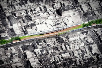 Cette piste cyclable, la Upside Down, dans le quartier du Queens à New York emprunte une voie ferrée abandonnée. Elle permet de créer un lien entre les communautés situées de chaque côté du rail. (Crédit : Nooyoon)