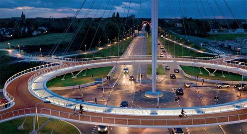 Ce rond-point à vélo à Eindhoven résout quelques soucis d’embouteillages. La ville a donc construit ce rond-point suspendu pour pédaler au-dessus des véhicules motorisés. (Crédit : citycycle)