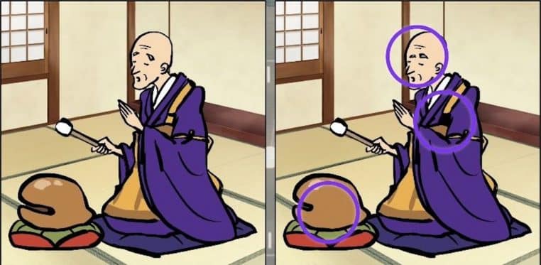 Il y a trois différences entre les deux images. Les sourcils des deux moines ne sont pas identiques, la bretelle de son vêtement n’est pas la même et l’objet devant lui n’est pas positionné de la même façon.
