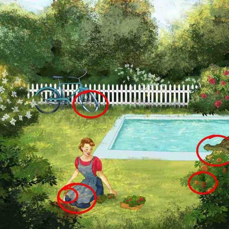 Combien avez-vous trouvé d’erreurs ? Au total, vous deviez voir 5 anomalies dans cette image. D’abord, il y a un souci avec la roue avant du vélo. Si vous observez le côté droit de l’image, vous remarquerez qu’un crocodile se trouve près de la piscine et qu’un ananas s’est glissé parmi les fleurs.
