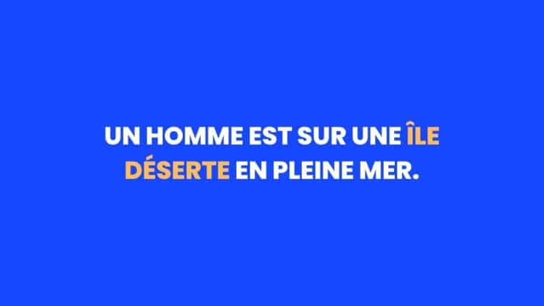 Un homme est sur une île déserte en pleine mer. Il a un petit problème : la partie ouest de l’île est en feu, et le vent souffle vers l’est. Il ne peut pas se jeter à l’eau, car elle grouille de requins mangeurs d’homme.