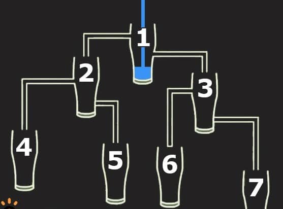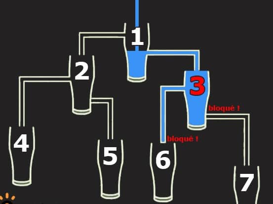 C’est le verre n°3 qui sera le premier à être rempli ! En effet, le tuyau entre le verre 3 et le verre 6 est bloqué, et il en est de même pour le tuyau entre le verre 3 et le verre 7.
