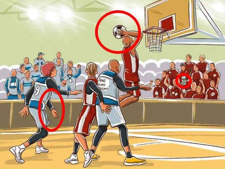 Voici les trois erreurs qu’il fallait trouver. Le joueur tient un ballon de football au lieu d’un ballon de basket. Le joueur qui porte le numéro 9 a un bras supplémentaire. Enfin, dans le public, un extraterrestre est assis.