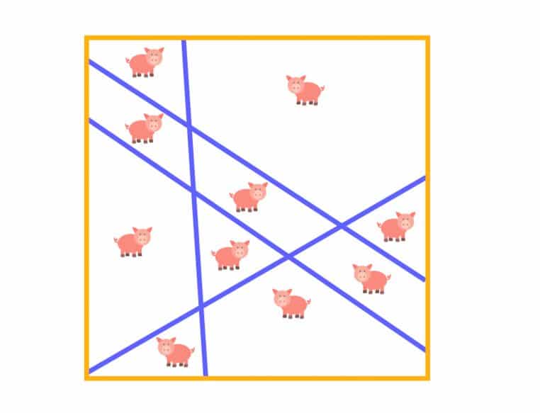 Un vieux fermier a besoin d’aide pour aménager son terrain. Il a besoin d’un enclos pour chacun de ses dix cochons. Vous devez les isoler en traçant uniquement quatre lignes droites.