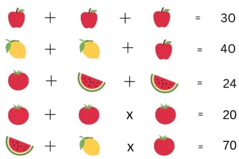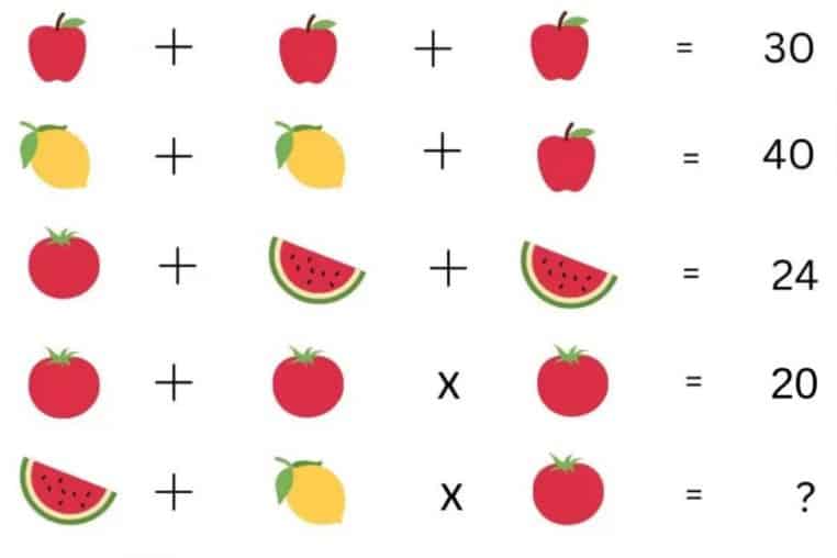 - 1 tomate + 1 pastèque + 1 pastèque = 24. Nous avons une équation comme suit : x + y(2) = 24. Ici, le plus simple est de déduire qu’une pastèque vaut 10, deux pastèques valent donc 20. Une tomate vaudrait donc 4.