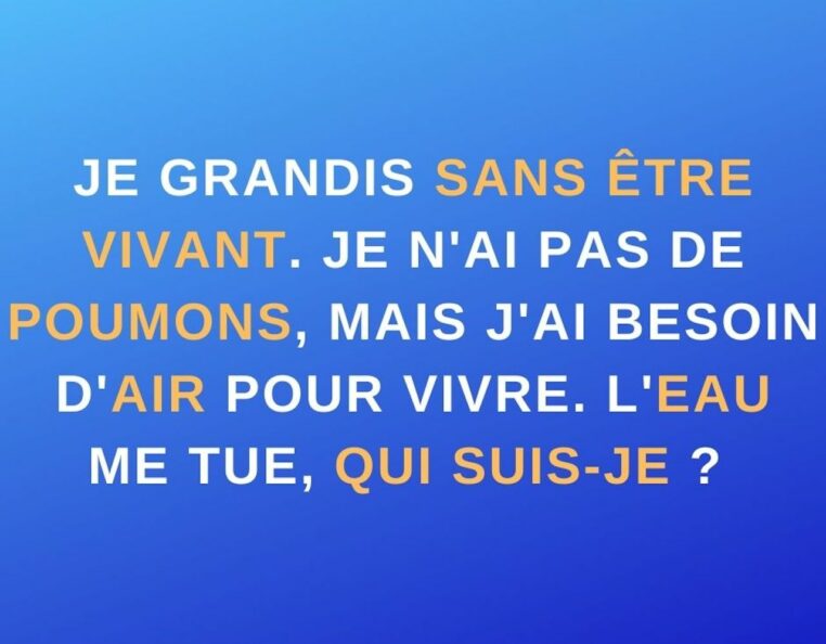 Je grandis sans être vivant. Je n’ai pas de poumon, mais j’ai besoin d’air pour vivre. L’eau, même si je n’ai pas de bouche, me tue, qui suis-je ?
