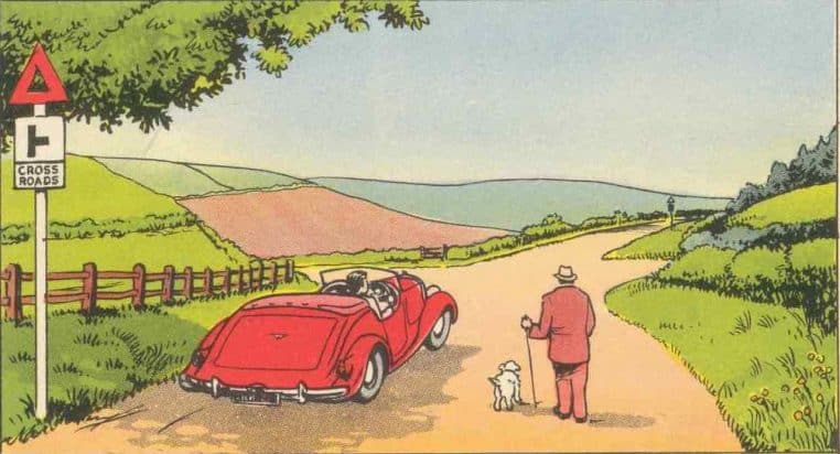 L’image ci-dessous représente une route de campagne sur laquelle se trouve un homme en train de marcher avec son chien. Près d’eux circule une voiture rouge. Mais une erreur se cache dans cette illustration. Saurez-vous trouver laquelle ?