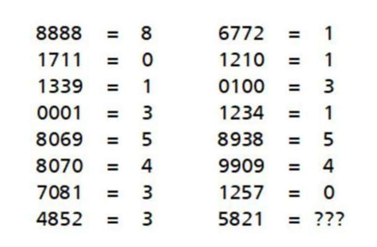 Pour trouver la valeur associée à chaque nombre, il faut compter les intérieurs (trous) des chiffres. Le 8 contient 2 trous. Le 3 aucun, etc. Pour 5821, le 5, le 2 et le 1 ne contiennent aucun trou. Tandis que le 8 en compte 2. Donc la réponse est 2.