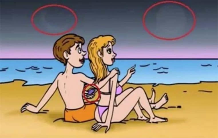 L’image représente une scène romantique en bord de mer : un couple est allongé sur la sable et observe le paysage. À première vue, tout semble parfaitement normal. Mais ce n’est qu’une illusion puisqu’il y a deux erreurs à trouver.