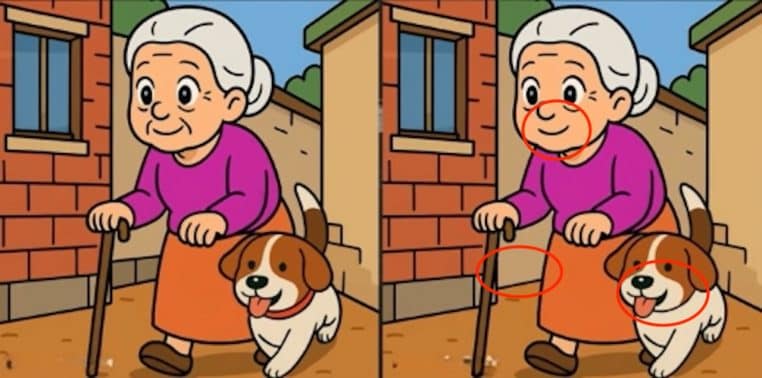 Test de QI : Trouvez les 3 différences entre ces images d’une grand-mère promenant son chien