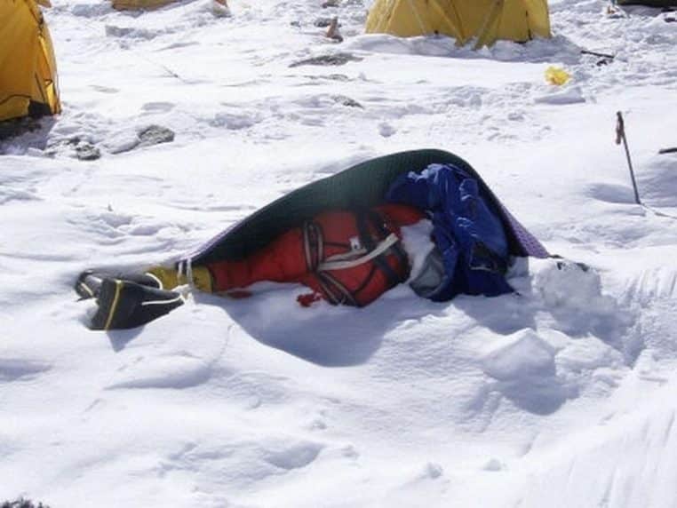 Encore un corps dont l’identité n’est pas connue. L’évacuation des corps étant trop dangereuse, de nombreux cadavres restent à découvert et servent de repère aux autres alpinistes.