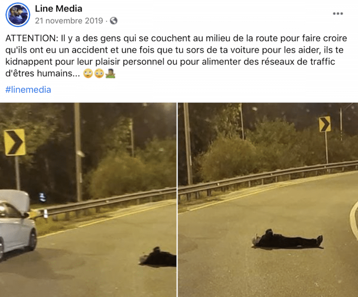 De plus, ces messages alarmistes sont systématiquement accompagnés de deux photos montrant un corps allongé au milieu d’une route éclairée en pleine nuit. La légende de cette publication explique : « Attention : il y a des gens qui se couchent au milieu de la route pour faire croire qu’ils ont eu un accident et une fois que tu sors de ta voiture pour les aider, ils te kidnappent pour leur plaisir personnel ou pour alimenter des réseaux de trafic d’êtres humains ».