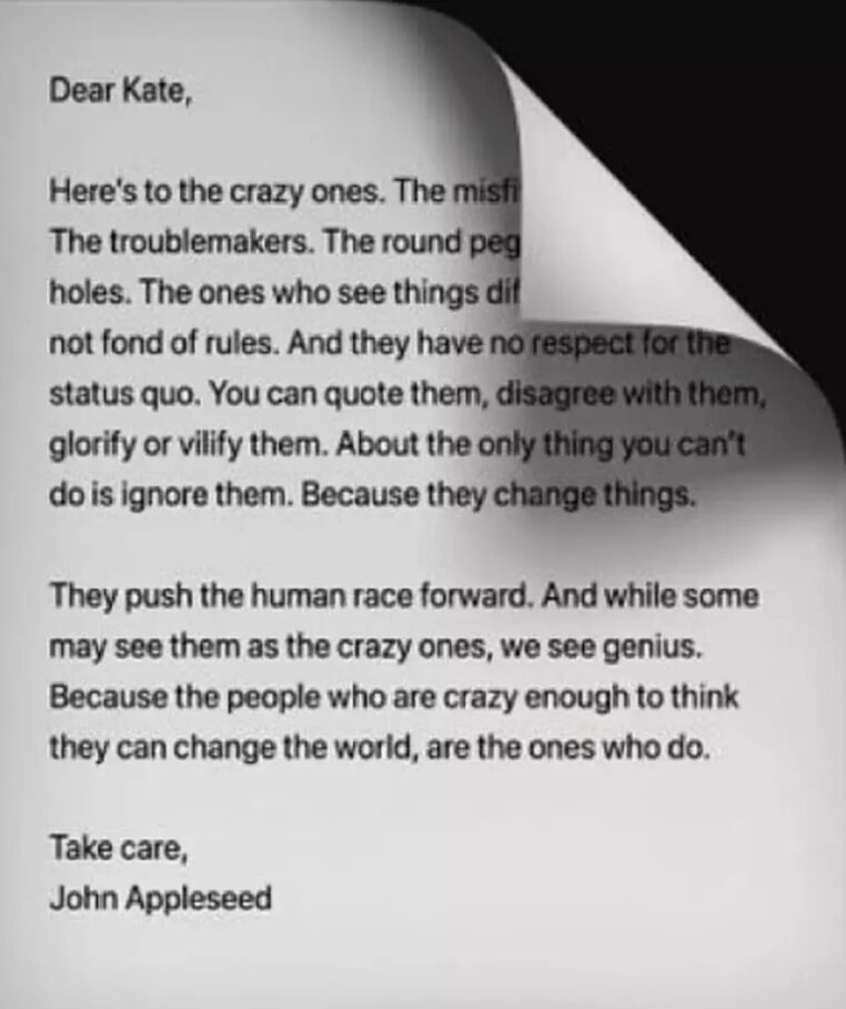La lettre se poursuit en disant : « Parce qu’ils changent les choses. Ils font progresser l’humanité. Et tandis que certains les considèrent comme des fous, nous y voyons du génie. Parce que ceux qui sont assez fous pour penser qu’ils peuvent changer le monde sont ceux qui y parviennent. Prends soin de toi, John Appleseed ».