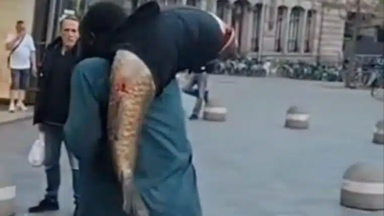 Un homme porte un poisson de 30 kg devant la gare de Strasbourg (vidéo)