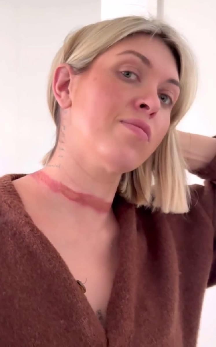 Pour illustrer ses propos, l’influenceuse a posté un montage qui résume ce qui s’est passé. Dans la succession d’images, on la voit se tenir près de la voiture avant d’atterrir à l’hôpital. « La robe qui m’a maintenue dans une prise d’étranglement », dit-elle. L’accessoire de mode a laissé une affreuse marque sur son cou !