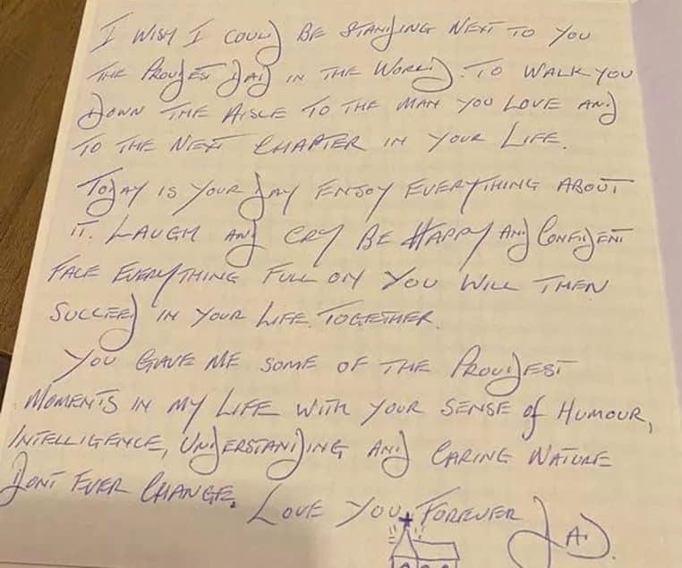 Lors de son mariage, toutes sortes d’émotions traversaient l’esprit de Freya. « C’était un moment tellement triste, mais tellement important pour moi que la carte soit lue à haute voix. Rien qu’en regardant son écriture sur cette carte, j’avais vraiment l’impression qu’il était là, et c’était tellement agréable », dit-elle.