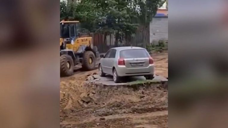 Toute la chaussée a été détruite sauf sous la voiture qui est désormais perchée sur un îlot de bitume. Une vidéo a été filmée par des habitants où l’on voit le tractopelle contraint de faire le tour de la voiture.