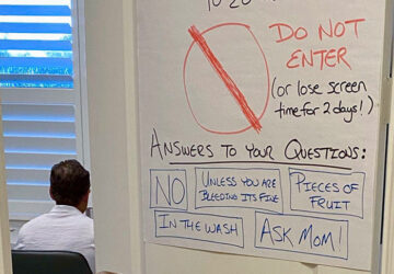 « Papa est en réunion. 28/10/2020. Ne pas entrer ! Ou vous serez privés d’écrans pendant deux jours. Réponses à vos questions : « Non », « Sauf si tu saignes, tout va bien », « Morceaux de fruits », « À laver », « Demande à maman ! »