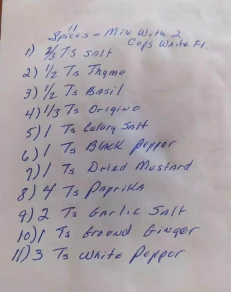 Parmi ces composantes se trouvent deux cuillères à soupe de sel d’ail et quatre cuillères à soupe de paprika. Cela inclut aussi trois cuillères à soupe de poivre blanc, « l’ingrédient principal » du poulet KFC selon Ledington. Selon ses dires : « J’appelle cela l’ingrédient secret. Personne (dans les années 1950) ne savait ce qu’était le poivre blanc. Personne ne savait comment l’utiliser ».