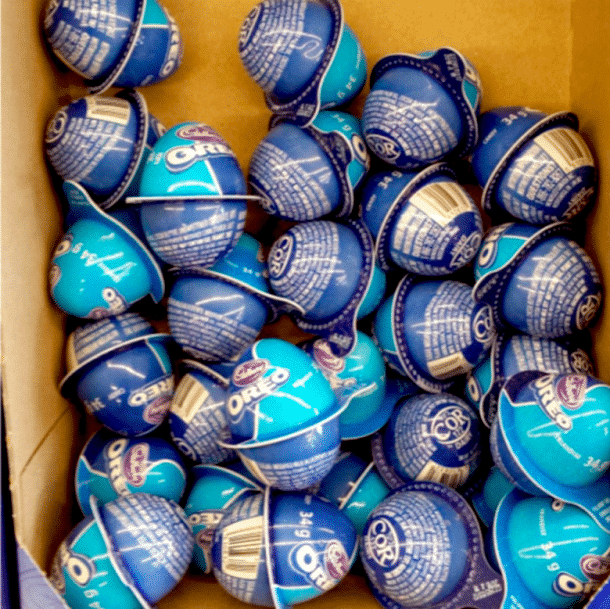 Ces œufs en chocolat fourrés aux célèbres petits biscuits Oreo raviront les petits, tout comme les grands. Et d’ailleurs, pour ceux qui ne savaient pas, il ne s’agit pas là d’un quelconque partenariat puisqu’Oreo appartient justement à Cadbury. L’association entre les deux était donc bien trop tentante. Il faut dire aussi que ces biscuits à succès se retrouvent dans à peu près tout et n’importe quoi : les tablettes de chocolat Milka, le Mc Flurry du McDo, des tartes aux Oreo… Bref, la liste est longue. Et on ne parle même pas de toutes les versions détournées du biscuit : goût fraise, beurre de cacahuètes, recouvert de chocolat blanc…