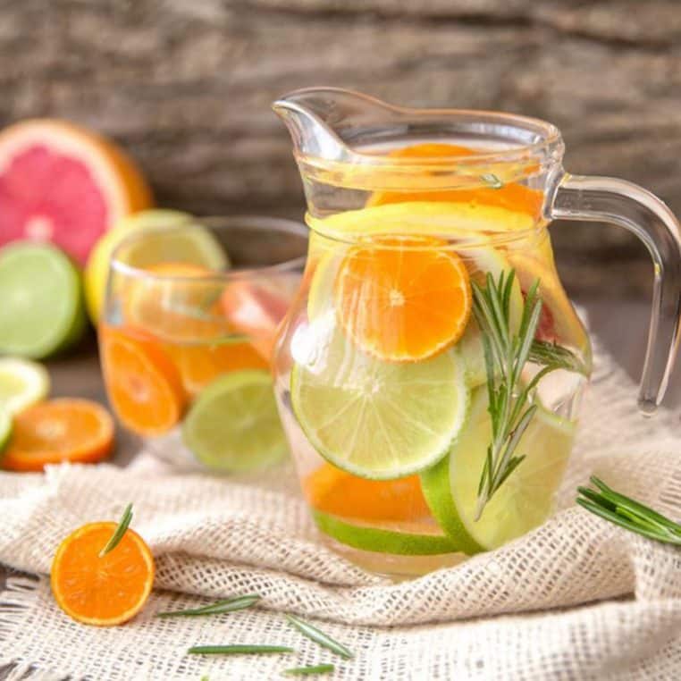 L’eau détox aux 3 agrumes nécessite, pour deux personnes, 6 oranges, deux citrons, 2 pamplemousses pour 2 litres d’eau. Mais ce n’est pas terminé ! Pour finaliser la boisson, déposez 1 ou 2 branches de romarin pour une infusion délicieuse.