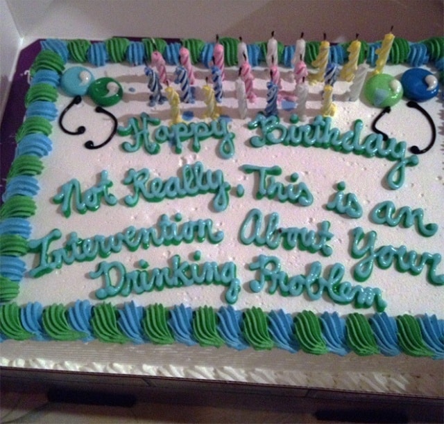 « Joyeux anniversaire. Pas vraiment. Ceci est une intervention à propos de ton problème avec la boisson »