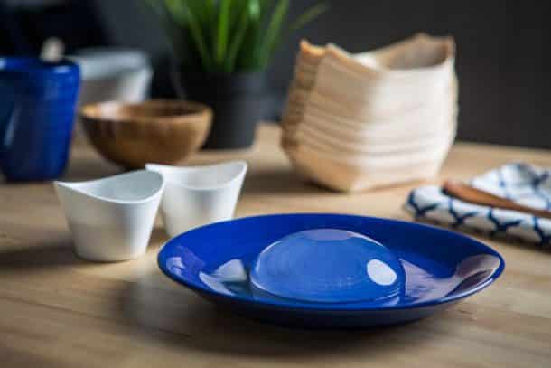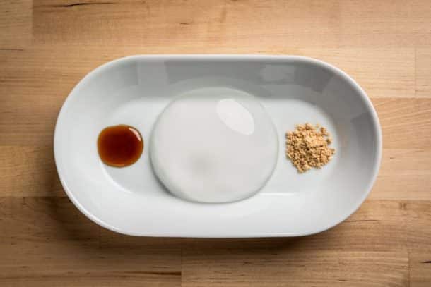 Le gâteau ressemble à une grosse goutte d’eau mais en réalité, ce n’est ni plus ni moins qu’un dessert qui « bloblotte« . Ce dessert serait originaire du Japon et se consomme traditionnellement avec de la poudre de soja grillé et du sirop à base de sucre de canne ou de soja. Son « vrai » nom est le Mizu Shingen Mochi et doit être mangé dans les 30 minutes au risque de le voir s’évaporer comme neige au soleil.