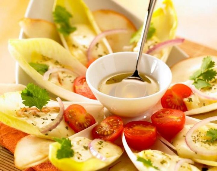 16. Des feuilles d’endives dans lesquelles on met : du bleu fondu avec quelques éclats de noix