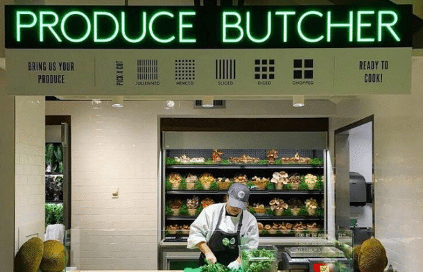 Nous avions eu droit aux plats préparés, désormais, la chaîne de supermarchés bio Whole Foods aura ses bouchers de légumes. Eh oui, si vous avez la flemme de couper vos légumes, sachez que là-bas, des gens sont payés pour le faire à votre place. En fait, le principe consiste simplement à lui apporter vos légumes pour qu’il les coupe. Vous pouvez les demander en dés, en tranches, en julienne, bref, en long, en large, et en travers ! Et il vous fait ça pour environ 95 cts les 450 grammes de légumes.